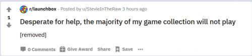 Wellll IDK how it did, but anyways, this damn pandemic is a stressful a-- time for everyone & I decided to spend most of my free time stuck home getting more platforms & games set up in LB to get my mind off of things...only 2 months later to not be able to play more than half those games & get no significant support...then I go to ask help on Reddit to find my post was ghosted? I don't mean to sound like a whiner, but you can't blame me for being a little letdown about it all -