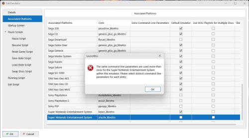 Hi all, Not sure what's changed, but in the past I used to be able to edit my retroarch emulator settings and assign multiple cores for different platforms. For example, for Super Nintendo Entertainment System I used to be able to add two entries, both named Super Nintendo Entertainment System, and one uses the bsnes core, and the other uses the snes9x core. This would then allow me to select one as the primary core, and one to use as an alternative. Today when I went to edit something in my retroarch settings, it would not allow me to exit/save settings until I deleted all those duplicate/different core entries. How do we do we setup alternative cores for retroarch now?... or is this a bug I've discovered? See pics for what I get as an error when I try to add a 2nd entry for Super Nintendo Entertainment System using the snes9x core. EDIT: I'm on version 12.1 and using Windows 11 64-bit... FYI