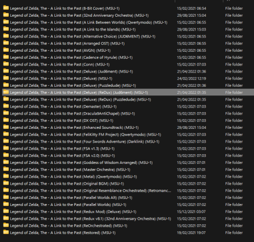 As i said before thats not a new game its just an additional set of PCM's, Its still just A Link to the Past. As for Turrican 4, again its a Hack of Rendering Rander R1, which is already an MSU-1 title. Just to show why doing sub versions just for music packs is pretty silly, heres just my Link to Past MSU-1 set Just imagine if i did a cover for every version, and this is only one of 194 MSU-1 titles, and most games have multiple PCM packs.
