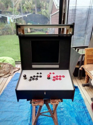 I first got into emulation AGES ago with the Amiga and Win-UAE. I grew up with the Amiga 500 and I think I still have 2 in the roof of the garage (still working last time I checked). Haven't really touched it in a while though. Recently, Having missed out on the NES Classic, I kinda started looking into it again, had a play and thought it might be interesting to build an actual 'Arcade' machine. I had an old Dell E8400 sitting around not really doing much so after some quick googling and searching on YouTube I decided it didn't look that hard and may as well take the plunge. I haven't done any woodwork since I was in school (15 years ago?) so you could say I'm going in blind. I ordered some buttons and joysticks from AliExpress and after about a month they showed up. Pretty stoked I grabbed some scrap wood and a panel layout from slagcoin.com and got to testing out my new purchase. The next step was to draw up some plans for a cabinet that will fit the computer, monitor and 2 player panel. I did a lot of searching and used images and other plans as a guide but eventually came up with something of my own (in hindsight, it might be a little big, but its all a learning experience). Once that was done I had to wait a little while until my Dad was able to lend me a hand. All the tools are his and even though he doesn't do a lot of woodwork now days he did quite a bit when he was younger and has the knowledge I don't. I went out and got the MDF, wrote down the measurements and got as much done as I could on my own, then last weekend Dad was able to help so we set about doing some cutting. The weather wasn't the best (garage is a mess so all the work is done outdoors) so we had limited time and only got the side panels done one day and the bottom and top cut the next. The side panels were done with a jigsaw and the straight cuts were being done with a circular saw so most of the time was measuring and clamping rather than cutting. Next few days was heavy rain so no work, but today was really nice. I decided to see if I could finish the cuts on my own and for the most part got the rest of the panels done without any issues (one little mishap but it should be easily fixed). So now all the panels are done. I just need to go out and get some thicker wood for the inside supports. Most likely 19x19 pine. At the moment I'm just using off cuts and scrap but its only 12mm MDF and I don't think it will be good enough structurally (+ its just stuck on with double sided tape so I can get an idea of the final product). I also need to pick up some screws and then I can begin putting it together. Then its finish off the control panel (drill holes and attach the buttons and joystick) and fix the monitor to the display panel and its off to the races. Hopefully if all goes well I'll have it finished and running by the weekend. Maybe even painted. Can't wait to get it finished. My boss has already suggested I bring it into work one night when its all done.