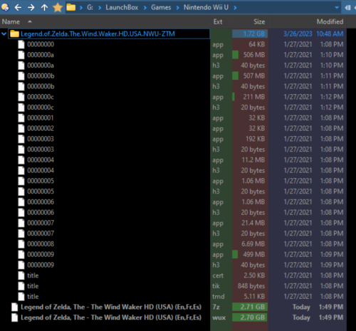 Thank you for the response, @sundogak. Unfortunately, I do not have many of the files that you say I should. I have no `.rpx` files anywhere, nor have I used Cemu to "install' any games. In fact, when I attempt to do so with that unpacked `.rar` file (the one with all the `.app`, `.h3`, and three `title.*` files), I get the error "Unable to find the /meta/meta.xml file inside the selected folder." I also do not have any `.wud` files nor any `.wua` file. I did make a mistake in my original post: the `.wup` file is actually a `.wux` file. And as I mentioned earlier, that file does not work inside Cemu. Here's what I have. Two versions of the same game: (The `.7z` file contains the `.wux` file; I just extracted it.) Is there a different version I should be hunting around for? The mythical `.rpx` version you mentioned, perhaps? I'm running out of places to look for it.