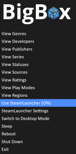 Hey @mp3deej, you have to disable SteamLauncher for it to not intercept game launches. In BigBox, you can do this by clicking this menu item (when it is turned off, the menu item will read 'Use SteamLauncher (OFF)'): Do note that this is a global switch which will enable/disable SteamLauncher for both LaunchBox and BigBox, so if you disable it in BigBox, it will still be disabled the next time you open LaunchBox (can be easily reenabled in LB by clicking the 'Tools' menu item and looking for the same 'Use SteamLauncher' menu item). With that being said, I am working on the BigBox fix as I type this.