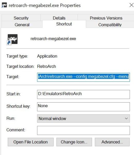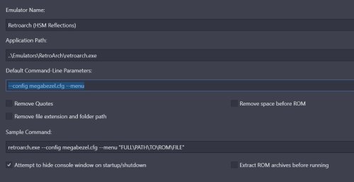 Hi all, I've created a second, custom, RetroArch.cfg file called megabezel.cfg - this allows me to have a main RetroArch install with a standard shader, and then a variation that uses a global Megabezel shader....all from the one RetroArch install. I'm able to boot straight into either one using either the main RetroArch/exe file for the standard shader, and a shortcut called "RetroArch-megabezel.exe" for the megabezel content (shortcut path is D:\Emulators\RetroArch\retroarch.exe --config megabezel.cfg --menu). All works perfectly. However, I'm now at the stage where I want to be able to use LaunchBox to switch between versions. I obviously have my default RetroArch install set up in LaunchBox, and I've added a second RetroArch instance in LaunchBox for the megabezel config. I've pointed this second instance of RetroArch in LaunchBox to the main Retroarch.exe file, and in the default command line parameters, I've echoed the windows shortcut content by putting in "--config megabezel.cfg --menu", giving me the sample command of "retroarch.exe --config megabezel.cfg --menu "FULL\PATH\TO\ROM\FILE" ^^ this all looks correct to me, and should work....but instead, any content loaded though LaunchBox using this second instance of RetroArch is NOT pulling the info from the megabzel.cfg file, and is instead, just launching vanilla retroarch. Is there a way I can correctly specify a custom global config file when launching retroarch under Launchbox?