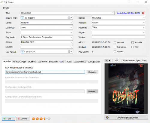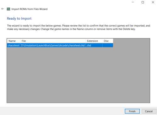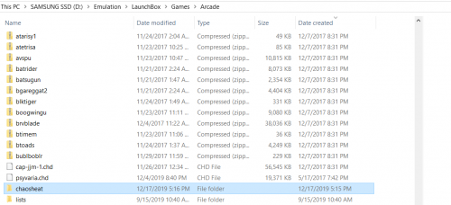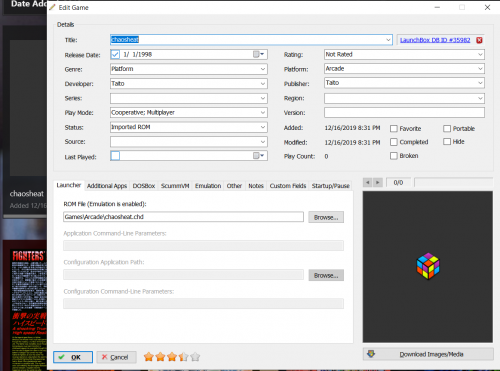 Well the issue is like I said I can manually change the name to "Chaos Heat" and import images fine and all, but for some reason it won't launch from Launchbox. Also as I said I do have another Taito G-NET game "Super Puzzle Bobble" that is CHD only and that game works without any trouble in Launchbox, so I am not sure if the CHD specifically is the issue, or if it is I am not sure why it would be in this case but not the other... XII Stag and Super Puzzle Bomber both work great for me without a problem and I have those just sitting loose in my Games/Arcade directory. However I will give putting the Chaos Heat CHD into its own folder a try just in case..