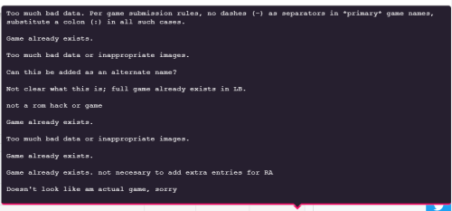Thank you for your reply! So, you are telling me that all the hacked rom we have in our DB (nes-snes-sms-md) should be removed? Maybe with a retroachievements platofom we should resolve. But which is the difference to add a rom to ps2 or to a retroachievements platform? "Clutter" is an interesting word. I think I am not cluttering the DB but I am filling it with the needed data for which the RA-feature was born. and I am glad you took the moderator guideline Rule 3, but we need to read to the end: "A game should only have 1 entry per platform. Multiple Disc games don't get entries per disc. Still 1 entry. Special Editions only get a unique entry on the Database if the game is significantly different than the already existing entry. I.e. Fallout 3 and Fallout 3 Game of the Year Edition would be two separate entries." There is more difference between Fallout 3 and Fallout 3 Goty or from a game and his hacked rom?