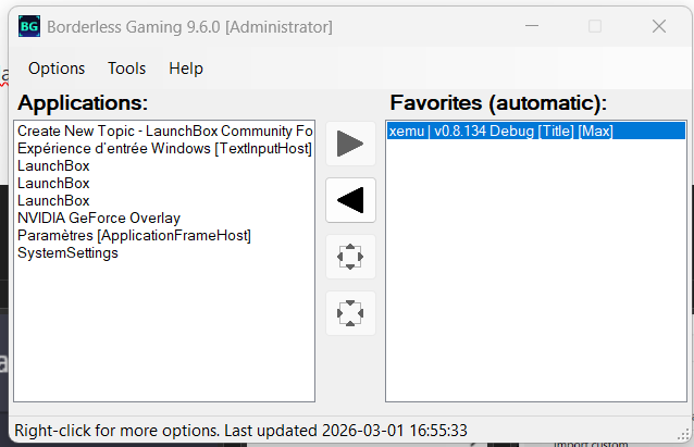 Hey, just sharing a quick tutorial because, I spent a few hours making this work. Basically I'm using Retroarch for most of my emulators and shaders. Especially the koko-aio crt shaders that are in my opinion the most immersive and realistic. The issue is that some consoles doesn't have a retroarch core yet making it impossible to add shaders. Fortunately someone called mausimus created an open-source app, ShaderGlass, which overlays any glsl or slang shaders on top of pretty much anything. Sounds fun, but it doesn't work as simply as you'd want. Here's how I made it work : 1. First you need a working Xemu emulator configurated. 2. Now let's modify some Xemu parameters : First, under Display tab, you need to disable fullscreen and fullscreen on startup : A little further down the page you'll want to set the display mode to Stretch and set the aspect ratio on Native : 3. Now you'll want to install the latest stable version of ShaderGlass from their official GitHub : https://github.com/mausimus/ShaderGlass/releases You can then import any missing RetroArch shaders like the missing koko-aio that are fullscreen : Set the input mode to Clone : Save your setup as a custom profile, call it something like xemu.sgp : 4. Now in Launchbox modify your Xemu emulator and remove the -fullscreen flag in the command-line parameters. Should be looking like this now : 5. Now, still in LaunchBox's Xemu emulator options, replace the Running Script by (update paths accordingly) : WinWait, ahk_exe xemu.exe WinWaitActive, ahk_exe xemu.exe Run, D:\LaunchBox\ThirdParty\ShaderGlass\ShaderGlass.exe -f D:\LaunchBox\ThirdParty\ShaderGlass\presets\xemu.sgp Sleep, 1000 WinActivate, ahk_exe xemu.exe WinWaitActive, ahk_exe xemu.exe WinWaitClose, ahk_exe xemu.exe WinClose, ahk_exe ShaderGlass.exe Basically what it does is simply : Wait for Xemu emulator to be ready Run ShaderGlass fullscreen with your profile Give back the focus to Xemu so that your controller works When Xemu end, exit ShaderGlass You would think it's done but unfortunately you still require borderless gaming to get Xemu fullscreen without being actually fullscreen. Otherwise your shader will clip on both sides and look like this : 6. Install the legacy open source version of Borderless Gaming which is still working great up to this day on Windows 11 : https://legacy.borderlessgam.ing 7. Add Xemu to your Favorites which means it's going to fullscreen window the app automatically : 8. Check Run on Startup under Options dropdown. Now everything is automated and working! You might wonder why I'm not using ResizeRaccoon which does the same thing? I tested it and it's working if you're not using BigBox as Windows shell instead of explorer.exe. In my case I'm shelling bigbox.exe so Resize Raccoon doesn't work because it's a system tray only app. It would be great if the dev fix this but I don't have time right now to raise an issue on their Github. It would be best in the future because it's open source compared to borderless gaming which is now paid. By the way this is working perfectly in BigBox. Enjoy!