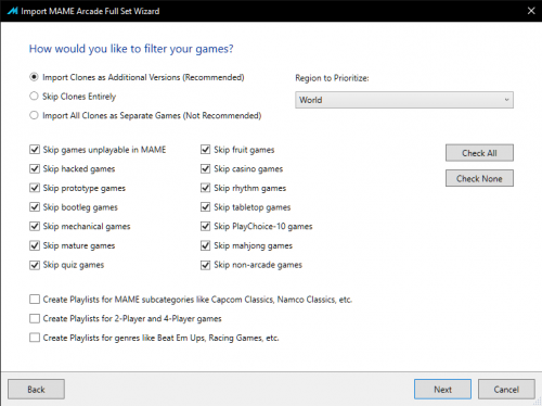 I'm writing this tutorial to help people cutting down the Mame full set with only what their controls can play. The current Launchbox importer is pretty good if you have an Xbox or Playstation controller. If like me you have a 2 players arcade machine you're probably limited with 4 way / 8 way joysticks leaving the analog games unplayable. This method isn't an automated process and will take some time. This tutorial have 2 objective depending if you're an archiver and want all playable games according to your controls - or - if you just want the best playable games according to your controls. I'll also share my All Killer No Filler's bat files so you can reduce the total of games to around 800 titles as a great start. I got through this process after fulling my 1tb SSD with the Mame set in my arcade cabinet. I had no space for newer games like Tetris Connected, MK10, etc. I also hated that the current Mame importer in LB left so many unplayable games with my controls. I've tried softwares like Rom Lister, Lightspeed Ultra-Fast Mame Importer Tool, Rom Center and CLRMamePro but they were either outdated, unsupported or irrelevant for what I wanted. I'm also from the school that everything should always stay updated. So yeah those outdated softwares weren't going to help. As for Mame it would take too much time to update regularly unless we automate some parts of this tutorial. This tutorial could be done each year so you're always up to date with all your roms. Otherwise please upvote this request on bitbucket which would automate all this process in the Mame importer of Launchbox. UPVOTE ME SO THIS PROCESS GETS INTEGRATED TO LAUNCHBOX! 1. PLAYABLE FULLSET - Skip to step 2 if you want All Killer No Filler 1.1 - PREPARING YOUR FILES Download the latest Mame full set on Pleasuredome. You'll need around 700 Gb disk space. [FREE] MAME 0.228 ROMs (non-merged) [FREE] MAME 0.228 CHDs (merged) if you already have a CHD set chances are that you don't have to download the new one unless it's really outdated. [FREE] MAME 0.228 ROMs (bios-devices) Copy all the ROMs in Launchbox/Games/Arcade 1.2 - IMPORTING IN LAUNCHBOX Import the full set in LaunchBox > Tools > Import > Mame Arcade Full Set... We'll import a non-merge full set with clones as additional versions. I highly suggest the World region to prioritize. You can check what you want to import or not (up to you). I highly suggest checking everything as it clears out the vast majority of the Mame junk. I suggest you uncheck Create Playlists as we'll cut down more games after that process and you should really learn to manually do your playlists, it's easy and it's a great thing to know. This process takes quite some time so might as well go search a beer and watch some Twitch in the meantime. If you feel a little lost at this step you can watch this video from 06:00 - 08:00. 2. ALL KILLER NO FILLER - Skip to step 3 if you have done step 1 to be written... UPDATE: Since my life has been busy and that I don't have the time to finalize the step #2 of this tutorial, I'll share with you what I think to be the best All Killer No Filler batch file (available at the bottom of this topic). This is the one I'm using for my customers and my own arcades and I hope you like it! Just copy the file mame-aknf.bat in your Mame romset folder (must be a non-merged romset) and open it. It'll create a folder called AKNF and all the roms will be there. The bat file won't move any roms so it doesn't break your source romset, it's safely copying the rom files in the newly created AKNF sub-folder. The batch file was made with Mame 0.238 so in many years it could become obselete, I believed at this time of writing this update (2022/05/27) it is safe to say that'll work great with newer version of Mame for years to come. If you still want to create your own All Killer No Filler romset you should be able to figure it out quite easily with all the information in this topic and my result mame-aknf batch file as an example. 3. KEEP GAMES COMPATIBLE WITH YOUR CONTROLS 3.1 - PREPARING FILES Download the Create Playlists from MAME plugin. Download the latest .ini Mame files you can find them here. Usually the first link is a .7z archive with all the .ini files. Extract the .7z archive in a folder. Place the .dll file of the plugin in Launchbox's Plugins folder. Restart Launchbox. 3.2 - CREATE PLAYLISTS Go in Tools > Arcade Playlists from ini and browse to your Mame files .ini folder. In the left column choose Control.ini file. Note that this tutorial is aimed at removing all the games incompatible with your controls. You may want to use this method to remove more games according to other criteria. In the center column you'll now have all the possible control configurations available from Mame. In the center column select a filter that matches your controls. Re-do step 3 until you have all the playlists of everything that is compatible with your hardware. *Note that the best thing would be to do the same with the buttons but I can't find a .ini file with buttons information. 3.3 - MERGE/EXPORT ALL PLAYLISTS Create a new playlist Playable Fullset and add all games from the playlists you've created at step 3.2. Select all games in the new playlist Playable Fullset and go in Tools > Export/Copy ROM Files from Selected Games to New Folder... and export to a new folder Playable Fullset. This will export all your actual playable games in a new folder. 3.4 - REPLACE ROMSET Now we want to replace the huge Mame rom set with only the roms you're using. Close Launchbox Delete all the roms (not the CHDs or bios) in Launchbox/Games/Arcade directory. Move all the roms from the new folder Playable Fullset in Launchbox/Games/Arcade. 4. CHD AND BIOS CLEANUP 4.1 - FILTER IN MAME Download the latest version of Mame (must match your romset version). I highly suggest to download the no-nag* version of Mame available here. This will remove all the advertisement screens when you start a game. They're not 