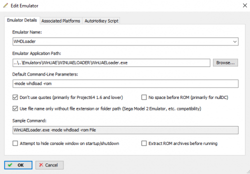 1. I found a nice solution for anyone wanting to scrape WHDLoad games and use winuaeloader. I downloaded the hyperspin xml, and put it in a folder I called "LBSCRAPING", which I put as a subdirectory of my WHD game files (the zip files). Then I just ran this little powershell script from the LBSCRAPING folder: [xml]$XmlDocument = Get-Content -Path '.\Commodore Amiga.xml' foreach ($game in $XmlDocument.menu.game) { if (Test-Path "..\$($game.name).zip") { New-Item -ItemType Directory -Name $game.description New-Item -ItemType File -Name "$($game.name).zip.zip" -Path ".\$($game.description)\" } else { New-Item -ItemType Directory -Name "_MISSING-$($game.description)" } } This will load all the folder names and game file names from the XML, then compare them to the files you have in the parent directory, and create a matching folder and <game file name>.zip.zip whithin (LB strips the extension, which is why the script does a double zip extension). It will create a "missing" folder if there is no match between the XML data and your collection. I suggest getting KG's WHDLoad Packs, as it's an almost perfect match, though multiple versions don't exist in the hyperspin xml file, and thus will be ignored. A simple script to delete the versions that dont get importet, could be made in a simmilar fashion, if you don't care about having all sorts of amiga game versions. In the end you simple import ROMs from the LBSCRAPING folder, and use folder names instead of ROM names for matching.. With the emulator only append the filename, and winuaeloader will find the game via the path configured within the tool itself. See my config below: BONUS: If you like me downloaded the WinUAE Loader, and get annoyed by the WHDLoad Register notice, just put the attached WHDLoad file into "WINUAELOADER\WHD\C", its the newest WHDLoad version, which is free and requires no registration! (Perfectly legal!) WHDLoad
