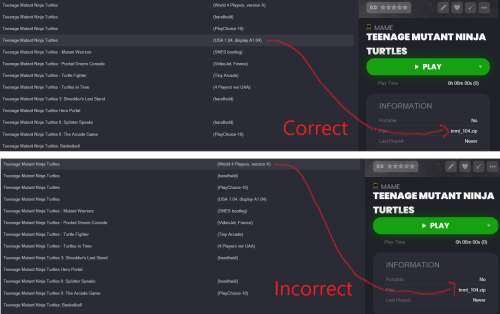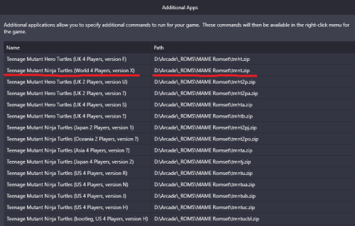 Hi Joe π I'm having a little problem when updating a romset (MAME) using the xml importer. So the problem seems to be that when an xml file is imported to a romset that has already been imported using your plugin, a game that has the same name as another game, but is not a clone, will sometimes inherit the launch file of the game it shares the name with. I have saved some images that hopefully explain this better. EDIT: I should have mentioned that I have only tested this problem when using the "import clones as additional apps" feature. As you can see, the "Teenage Mutant Ninja Turtles (World 4 Players, version X)" is incorrectly launching using the same file as "Teenage Mutant Ninja Turtles (USA 1.04, display A1.04)", "tmnt_104.zip". However, if I go into the additional apps menu for (World 4 Players, version X), the correct file shows as "tmnt.zip" as you can see below. So it is only the launch command that is inheriting the incorrect value. I tested this with both an updated xml and also just using a duplicate xml of the original and both displayed this problem, which indicates that it's not a problem with there being changes to the xml file, but rather repeat uses of the xml importer for the same romset cause this issue. I was also able to observe the same problem when updating an FBNEO romset as well. The workaround to the problem is to just delete the rom entries from launchbox and run your importer from scratch to update a romset, but I thought I'd check with you in case there is any easy fix π Hopefully I've made sense here and thanks again Joe, this plugin is my favourite.