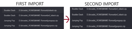 I did some testing to see if I could isolate the issue and I may have found something. I created an XML file with just four games which I had observed the issue with to see if there was anything in particular that stood out. It turns out that the order in which they are listed after importing (when sorted by title) would determine whether or not a subsequent import would function correctly, or if one of the games would inherit the launch file of the other. From the testing I have done so far, it seems that if the games' filenames are ordered in alphabetical order, the problem will occur. If they are in reverse-alphabetical order, the problem will not occur. I've attached an example of what I mean below. Whether the game files are in alphabetical order or not seems to be random, and will sometimes change at random just by closing and reopening LaunchBox even after they have already been imported. As you can see, the Boulder Dash files (alphabetical order) end up with the error after the second import, whereas the Jumping Pop files (reverse alphabetical) do not. If the Jumping Pop games were the other way around, they would display the same behaviour as the Boulder Dash games. I tested across all 3 import options (import everything, clones as additional apps, no clones) and the issue was consistent across all 3. I attached the XML file I have been testing with in case that is of any use. No problem if you don't get around to checking this out, I just enjoy helping to troubleshoot π importer boulder dash.xml