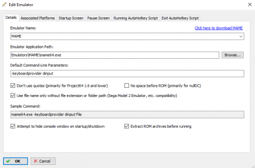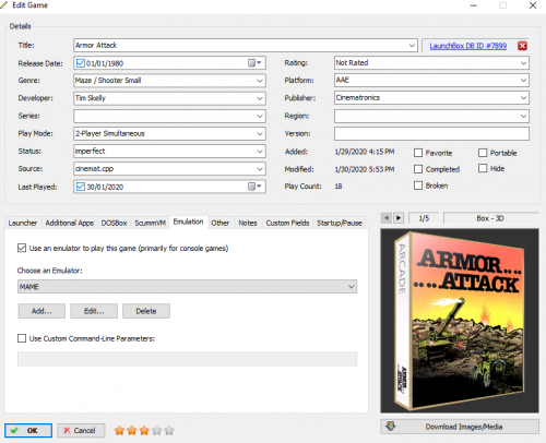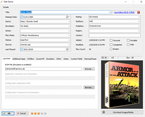 Hi Guys, Wonder if you could assist please, I am doing a fresh build of LB, and I have tried to add AAE, scraped as Arcade - they are using MAME as the emulator but they wont load through LB. The games all load through the MAME UI though. I have added the AAE games folder to MAME, and made sure that the fully qualified path shows in the mame.ini file. I have tried ticking everything on/off on the 'Edit Emulator' screen. MAME is version 0217b (from today). I have tried searching through the issues on here, but cant seem to find the resolution, your assistance would be very appreciated Thanks, Andy