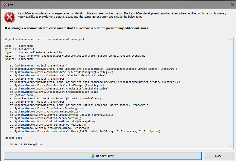 I could reproduce the crash and give you the error that launchbox throws Edit: heres what happens when i open launchbox.next and click Tools , Options on a good launchbox install Object reference not set to an instance of an object. App: LaunchBox Version: 8.2-beta-7 Type: System.NullReferenceException Site: Void (Unbroken.LaunchBox.Desktop.Forms.OptionsForm, System.Object, System.EventArgs) Source: LaunchBox at (OptionsForm , Object , EventArgs ) at Unbroken.LaunchBox.Desktop.Forms.OptionsForm.deviceComboBox_SelectedIndexChanged(Object sender, EventArgs e) at System.Windows.Forms.ComboBox.OnSelectedIndexChanged(EventArgs e) at System.Windows.Forms.ComboBox.set_SelectedIndex(Int32 value) at (OptionsForm , Object , EventArgs ) at Unbroken.LaunchBox.Desktop.Forms.OptionsForm.enableGamepadCheckBox_CheckedChanged(Object sender, EventArgs e) at System.Windows.Forms.CheckBox.OnCheckedChanged(EventArgs e) at System.Windows.Forms.CheckBox.set_CheckState(CheckState value) at System.Windows.Forms.CheckBox.set_Checked(Boolean value) at (OptionsForm ) at Unbroken.LaunchBox.Desktop.Forms.OptionsForm.LoadValues() at (OptionsForm , Object , EventArgs ) at Unbroken.LaunchBox.Desktop.Forms.OptionsForm.OptionsForm_Load(Object sender, EventArgs e) at System.Windows.Forms.Form.OnLoad(EventArgs e) at System.Windows.Forms.Form.OnCreateControl() at System.Windows.Forms.Control.CreateControl(Boolean fIgnoreVisible) at System.Windows.Forms.Control.CreateControl() at System.Windows.Forms.Control.WmShowWindow(Message& m) at System.Windows.Forms.Control.WndProc(Message& m) at System.Windows.Forms.Form.WmShowWindow(Message& m) at System.Windows.Forms.NativeWindow.Callback(IntPtr hWnd, Int32 msg, IntPtr wparam, IntPtr lparam) Recent Log: 10:49:40 PM Exception I see now that the reason it went to arabic was because the Options menu that shows after i bypass this error has arabic set by default for some reason, and i simply clicked OK without noticing. If i dont select arabic and just cancel the options menu, .next doesnt shut down, but will throw that error whenever i try to go to Options. If i happen to just click ok on the options screen with arabic selected, Launcbox.Next says it needs to update the language and video engine settings and then starts up like this I don't care about the language thing, its just the options menu is bugged. I hope this helps in some way. You can mark this closed as it seems to have been the inadvertent language switch that really did a number on my install.