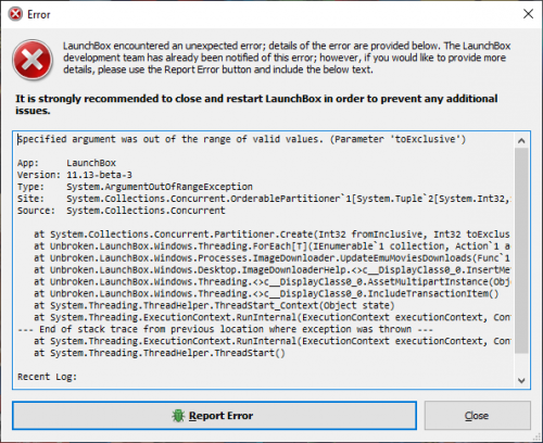 21. Not sure what happened, but after I sent you the PM and restarted my PC because a Windows Update, I now am greeted with this error that closes off LaunchBox when I pick "Close". BigBox seemed to work fine, but seems while the error pops up is when LaunchBox is "Parsing EmuMovies". Just very odd