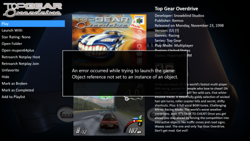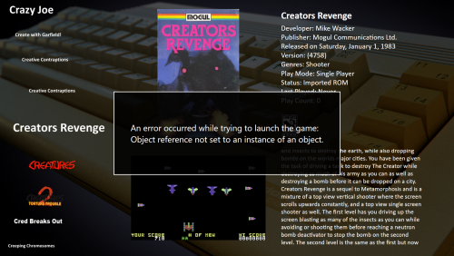 6. Could it be that I need to switch all the emulators, even the ones not giving the error to another directory and then close the tab to the switch them all back? I just went in a fixed the one that seemed broken that way and then launched BigBox to find the previous one I fixed before had went back to being broken. I hope in the next Beta this all can be resolved. I don't know if me launching a C64 game with CCS64 in LaunchBox to test it before I ran back to BigBox somehow messed it up too or not. I just know this release seemed to cause more headaches than anything, but I'm sure the next release will be far better since they know what issues there are. I think instead of running BigBox and coming across errors when I launch things, I'm gonna just stick with LaunchBox since that seems to not have this issue as far as I know until the next Beta comes. Thanks for the help though @Retro808 UPDATE: So I guess the error happens within LaunchBox too because I was trying to Launch a game with Mednafen and got stuck on the loading screen to where I had to close it off with Alt+TAB and couldn't see my cursor anymore to where I had to Alt+Ctrl+Delete to Sign Out of Windows 10 to then sign back in so I can see my cursor again.