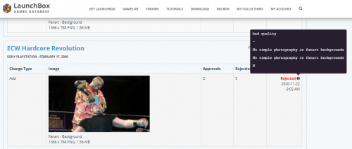 I usually don't give reasons unless I'm requesting to replace or remove something. I may decide to start doing more reasoning later on to avoid confusion. I just try to quickly get through things since I'm even trying to make sure all Platforms of a game has a Background instead of just certain ones because I know how annoying it is as example that the Genesis version of a game has all these Backgrounds, but like none for your Super Nintendo version. I understand the space issue, but I'm also going for quality too. PNG for me seems much cleaner looking than JPG, especially like when I finish what I'm working on if I save it as JPG is then looks a bit more grainy than it should be. Other than all that I'm glad to hear what I'm doing is increasingly becoming a huge help to the community in not only popular classic titles, but also ones that are likely personal favorites to some out there who know doesn't get the loving treatment it actually deserves, especially when art for it is extremely scarce in which I have to dig even deeper in doing the game some justice in creatively finding out some stuff for it more than just a simple Google search.