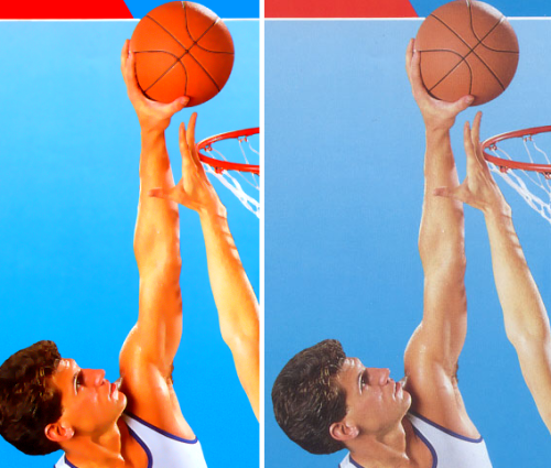 Just wanted to let you know, while I'm uploading missing flyers (mostly Japanese ones), I'm trying from time to time to re-upload some scanned flyers in the Arcade section if I see issues. I'm trying to put back some very good quality scans in the Arcade sections that have been, in my opinion, put in a worse state than what they were originally. Mostly there has been over-killing with painting so that the background color is monochromatic (single hue) and making the colors "pinkish" and very strong/unnatural were some red turns into more pink than it should be for example - most of these kind of edits have been uploaded in PNG format. But less talk more images: On the left the clearly edited one, and on the right the original scan (both from the same source) Issues: overbrightness, too heavy on the colors, upper background is missing the dots that are supposed to be there and doing that paint-job has caused the text to partially vanish. In detail, click the images to open them in full size: Same here, while trying to "clean" the grey texture the text takes a hit: And here's an example for Donkey Kong, where the green gradient (going from slightly darker/lighter) has been wiped out completely and the black edges are blocky instead of smooth: This is also a request to the developers to please add more image types so we can have fan-made edits/reconstructions for those who hate to have any scratches and prefer extra-clean looking/uniform images and for us who prefer to keep high quality scanned images as much as untouched/authentic as possible with only minimum changes that are mostly unseen (like cropping if the scanned image has background not belonging to the image/centering etc.). I've discussed about my opinion earlier here. By the way, the person who made those uploads in the Amiga section changed his behavior to a more respectful approach keeping it to the rules - thank you!: EDIT: Found an excellent example of that over-bright/over-colorized issue: Here the logo just doesn't stand out like it does on the original scan. The skin is way too red/not natural and so is the basketball. I'm afraid there are hundreds of Arcade scans that have been overwritten with these kind of edits... if anyone would like to help re-uploading the original scans, you can find most of them here: https://flyers.arcade-museum.com/?page=archive&db=videodb