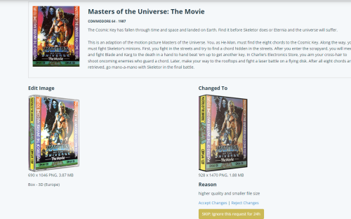 First of all, Happy New Year! I've recently seen multiple claims that are debatable in the Commodore C64 section - and since this one is about Masters of the Universe, I couldn't keep silent about it 😎: Yes, the pixel size is bigger and smaller in file size on the image that is replacing the previous. But that's where the "good news" ends. If you open both pictures in full-size (either opening them in their own tab and pressing the + button to get them full-sized or downloading them separately and looking them at actual pixel size): It's clear that the "smaller" one is much sharper and has more details and more vibrant colours. The other one has just been made bigger from it's original resolution and losing quality in the process - I don't know if someone is making those bigger in purpose for them to have them replace the other ones (a bit egoistical if that would be the case): (you can click this image I've put together with the same resolution, should open in full-size automatically) I'm not the author of either of these, but I do like the database to have high quality images instead of just bigger sized images. I think the smaller one is more realistic and uses a very nice plastic cassette tape template, perhaps using a bit too much of the light reflection effect, but it's the most authentic in my taste. But do open both images in full-size to see my point about image quality. And one other note: Please do not rely on just one source of information when changing the metadata in the database. Too many times have I seen mistakes from Moby Games been transferred in this database just because it's the only source used. In many cases the developer of different ports is missing or wrong. as I've said before it's best to use in parallel websites that are platform specific (ie. https://segaretro.org/, http://hol.abime.net/, https://www.lemonamiga.com/, http://www.atarimania.com/, https://cpcrulez.fr/ etc.).