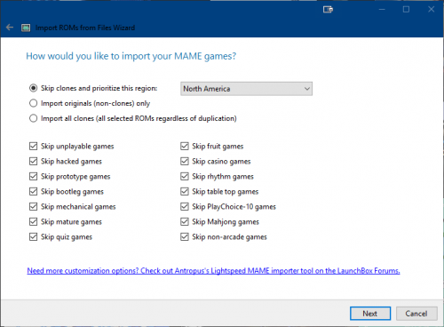 Hey everyone just a quick import question. If I import all my Mame games and select Mame as my default emulator, I get a screen at the end asking about region priority, not importing hacks, casino, majhong games, etc. It also will create playlist like CP1, CP2, Midway Classics, and so on. It's definitely a great tool included when your importing all those games. But if I import my Mame games with Retroarch as the default emulator, I don't get that screen and it will just import everything. I've tried importing all my games using Mame as default and then switching my default to Retroarch hoping that it would work but I can't get it to work. Does anyone have a solution to be able to use that import option but having Retroarch as the default emulator?