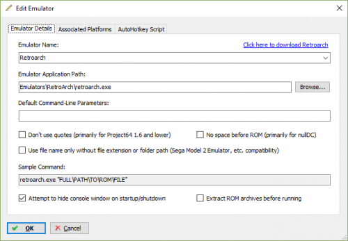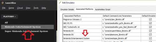 Hi, first off thanks for all the hard work, love LaunchBox! I've been trying to set Retroarch (newest 1.7.3) to work through LaunchBox (8.2) to no avail. I've followed several video guides and scoured the forums for an answer and nothing. I don't know what I'm missing or doing wrong. I'm concentrating on running NES games. They are running fine directly on Retroarch with the nestopia core (and other cores). On LaunchBox I've made sure I have the correct core on the Associated Platforms (pointing to the one downloaded on RetroArch) as well as the same name for the platform on the left side in LaunchBox, but when I click on the imported ROMS nothing happens. I've tried with other cores such as bnes, FCEUmm, Mesen, and still nothing. I've tried with some SNES cores too for SNES games, and the same. All of these cores are running the ROMS fine directly on RetroArch. On LaunchBox I've been able to run the ROMS using standalone emulators (Nestopia and SNES9X), but I can't get Retroarch to work. I guess I could stick to the standalones, but personally I've found Retroarch much more convenient. And the LaunchBox + Retroarch combo is just perfect. Any help is truly appreciated. Thank you!