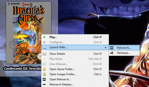 OK. I deleted RA from Tools\manage emulators. Re-added it, on the Associated Platforms I changed the core from nestopia to mesen. I made sure the mesen core was downloaded in RA and actually tested it with the c:\nes\castlevania3.nes game and it runs fine. Unfortunately the game won't launch from within LB using retroarch. I tried again the Launch With... and chose Nestopia, to see if anything else could be wrong, but the standalone emulator just works, not RA.