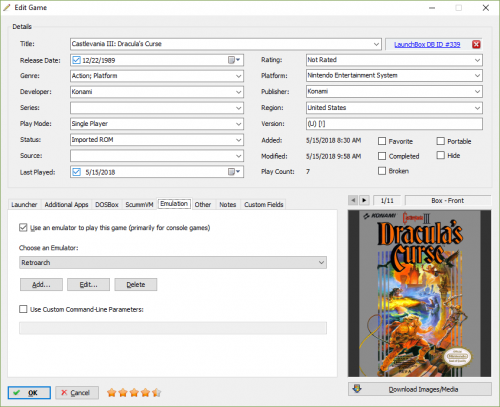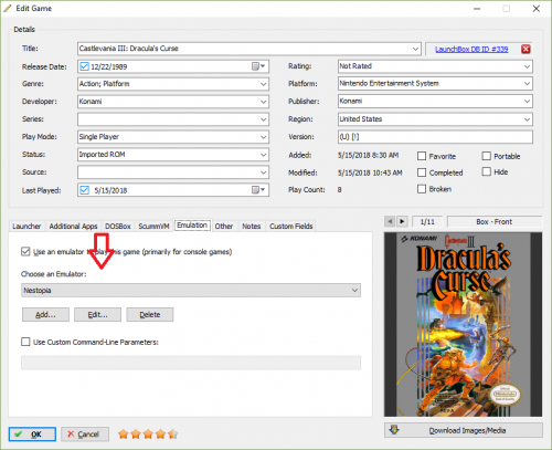 Again, to make sure there is nothing wrong with the rom path or rom file I clicked edit on the game and on the Emulation tab switched the emulator from Retroarch to Nestopia and the rom launched ok.