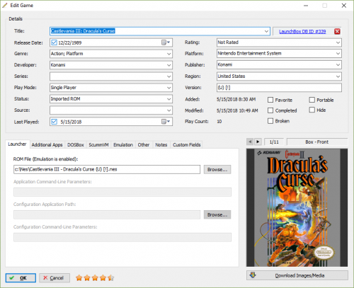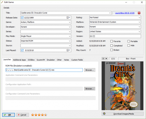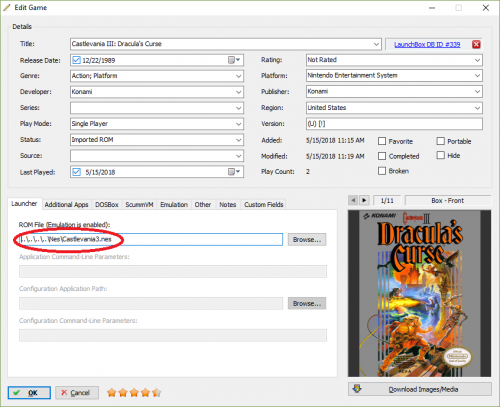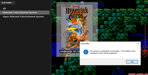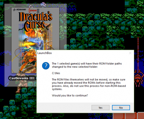 Great! That gets my hopes up. If it where a path problem for the rom wouldn't the Nestopia emulator (through LaunchBox) fail to load the game? It is not. Anyway I followed your suggestion. First I copied the rom (through windows explorer) "Castlevania III - Dracula's Curse (U) [!].nes" to c:\nes to keep things simple. Then I clicked the game went to tools/change roms folder path and pointed to the new folder. Still not running.