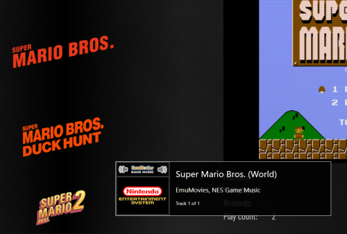 So, either I have totally missed this in the past, or its a new BigBox feature. When I scroll through my games I am noticing some games cause a EmuMovies popup showing the music track, from EmuMovies. See attached for an example, SuperMario Brothers on NES. Can I turn this off, so it will not popup? Also, what exactly is the purpose of this popup? Thanks