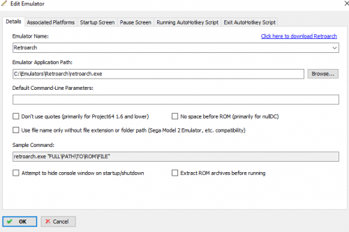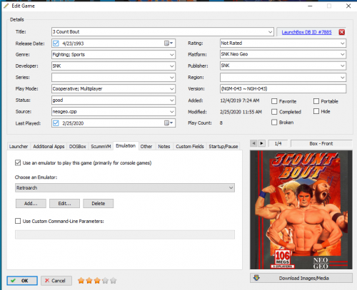 SentaiBrad Posted May 15, 2017 Posted May 15, 2017 Well, I'm still a bit confused; I think something might be getting lost in a language barrier. For the arcade systems (though I don't recommend RetroArch for them), as long as you have the proper roms and BIOS for them all together, you import them in to LaunchBox and set the Associated Command line properly when editing RetroArch, it should work. If it's not launching, then a setting in LaunchBox is not correct, especially if they're launching outside of LB. I would be willing to bet it's in the associated platforms tab. The system name in there needs to match what you've called the System, and the command line needs to be set properly. You shouldn't need to check any of the other boxes on the first tab when you edit an emulator. You might also want to try RetroArch 1.5. I do suggest users keep up with releases. It shouldn't change too much in this case, but making sure it and all of your cores are updated is crucial in general. Quote