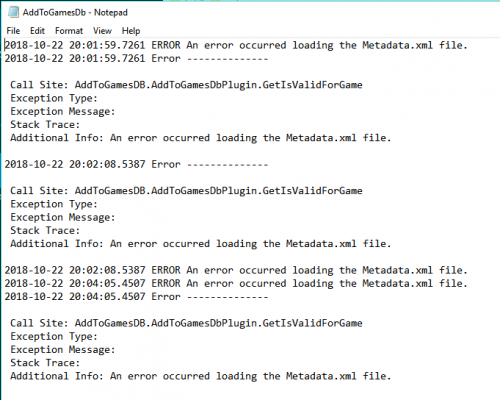 Hackiss Posted October 22, 2018 Posted October 22, 2018 (edited) When i rightclick a game, the plugin options are greyed out. Here's the log file AddToGamesDb.log Edit: Upon further testing i found out that the .xml file won't open in internet explorer nor microsoft edge for some reason. It will however open in both sublime and Chrome, but those apps can't be set as standard apps Does anyone have any suggestions about what to do? Edit 2: Upon updating the file to show a more detailed log, this is the log i got 2018-10-25 23:21:34.1571 Error -------------- Call Site: AddToGamesDB.AddToGamesDbPlugin.GetIsValidForGame Exception Type: Exception Message: Stack Trace: Additional Info: An error occurred loading the Metadata.xml file. 2018-10-25 23:21:34.1571 ERROR An error occurred loading the Metadata.xml file. 2018-10-25 23:21:34.1571 DEBUG Could not deserialize object of type LaunchBoxPlugins.Data.Entities.Metadata.LaunchBox from F:\LaunchBox\Metadata\Metadata.xml 2018-10-25 23:21:34.1571 DEBUG at Common.Utilities.ConfigurationMapper`1.Load(ConfigFileType type, String path) at AddToGamesDB.AddToGamesDbPlugin.GetIsValidForGame(IGame selectedGame) Edited October 25, 2018 by Hackiss 1 Quote