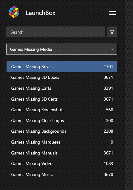 JoeViking245 Posted April 25, 2023 Posted April 25, 2023 2 options: On the left sidebar, select Games Missing Media. Then click Games missing Boxes. Select Tools, Audit and then select All games. To select a single platform, on the left side bar, select Platforms, click the platform you want to audit, then select Tools, Audit and click that platform. 1 hour ago, MiamiLamiW said: And is there a quick way to correct the names it searches for in the Box Art database in bulk rather than doing and fixing it one at a time? The image files are associated to the games Title or ROM name. You can't really change that. When you import images from the LaunchBox database (when initially importing games, using the bulk media updater or while editing an individual game), LaunchBox will save them using the games Title. Quote