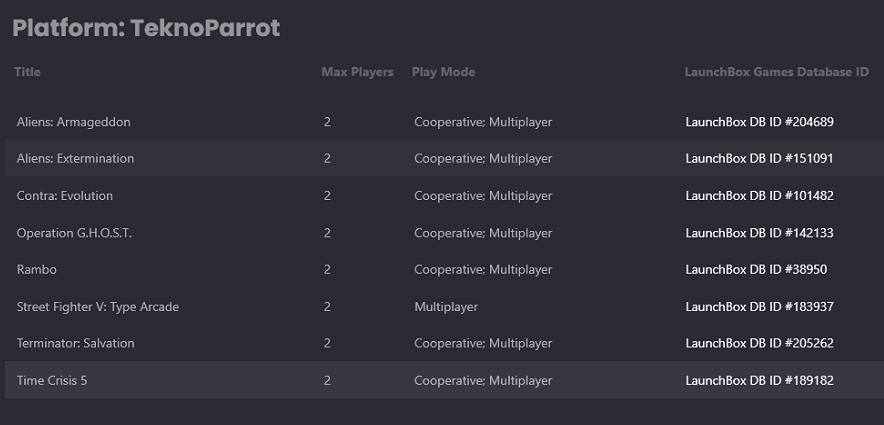 Lastly, it would be really cool to add a field to the DB that included "Control Type" (or something) where a standardized list of controls types could be entered.   "Lightgun" "360 Wheel" "360 Wheel & Hi/Lo Shifter" "Twin Stick" "Dual Twin Stick" "Rotary Stick" - Something like that.   So edits could be made to define and standard control types and then games could be filtered based on available controls.   Lightgun games are often in the ""shooter / gun" genre for mame, but just "Shooter" or "Action Shooter" in TeknoParrot, or just "Shooter" in Sega Model 2.  Again, inconsistency.   I guess we could just agree upon a unique 'genre' entry too, but that doesn't cover other non-standard control types.
