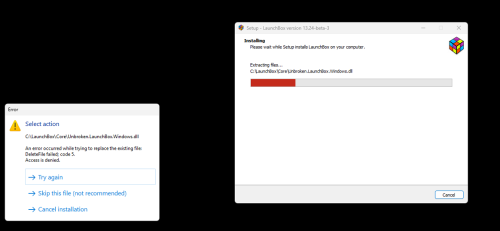 Fursphere Posted September 19 Posted September 19 9 minutes ago, faeran said: That's interesting. We run many updates, many times each release cycle, and haven't experienced that one yet. Just ran another one in Big Box after your post here but it seemed to run fine. If anyone else has experienced this exact thing, let us know, however, it's entirely possible it's some oddity happening on your machine, which while it would be nice to know, would be one of those hard ones to track down. I'm assuming that you can see 2 installer windows going on at the same time and you can put them next to each other? Or do you only get that access error message? I couldn't grab a screenshot fast enough. There were two running. First one finish and actually launched BigBox. Second one errored out.