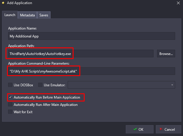 wolfenstein0099 Posted Saturday at 06:17 PM Author Posted Saturday at 06:17 PM 1 hour ago, JoeViking245 said: If it works outside, I'd check that the Additional App is setup correctly. Give it a name Point to LaunchBoxs' AutoHotkey.exe WITH QUOTES, add the "full/path/to/your/script.ahk" Check Run Before Click OK to save and close Sorry Joe. Im just confused about what to write in the defulat comand line perramoters. Not exactly what you mean. Quote
