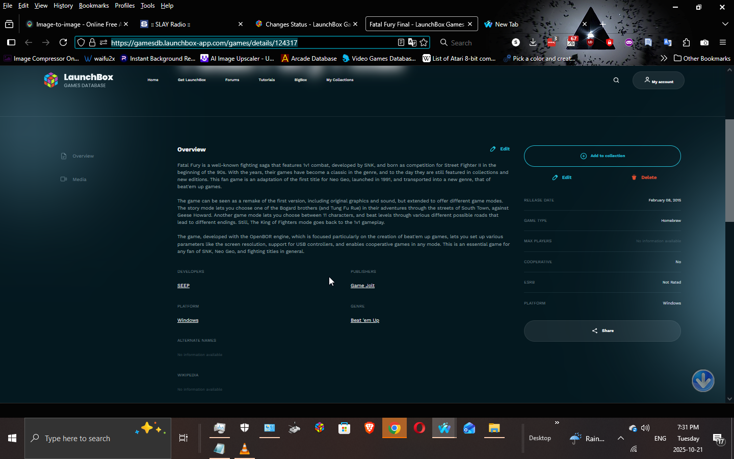 MJF Posted Tuesday at 10:13 PM Posted Tuesday at 10:13 PM https://gamesdb.launchbox-app.com/games/details/124317 This game is listed in the overview as made using OpenBOR I changed the platform, which got accepted However, it's still listed as a WINDOWS game I also did a similar thing to a MUGEN game falsely listed as a Windows game, and it will not change either. I've also deleted a fake game, that is still in the db, despite it getting accepted for deletion MULTIPLE TIMES. https://gamesdb.launchbox-app.com/games/details/428076 Quote