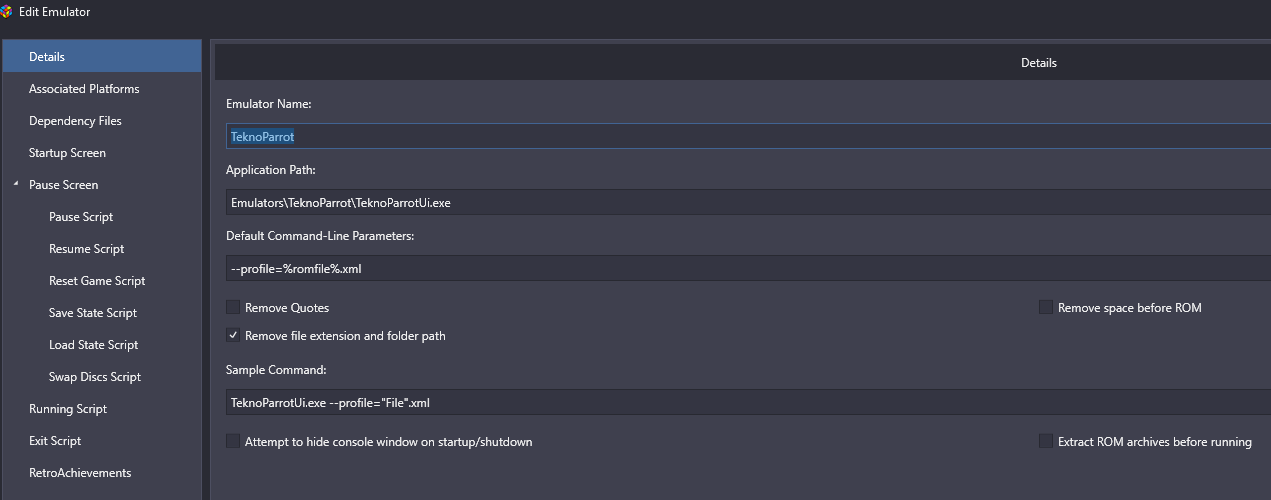 JAC-Gaming Posted October 27 Posted October 27 Hello everybody, I've been struggling with TeknoParrot when it comes to the pause screen in LaunchBox. All other systems, I have gotten the pause screen to work just fine. Some emulators I had to add a AHK running script to gat the games to shutdown properly but ultimately that took care of the issues. The (2) main issue I have are the following: 1. The emulator doesn't actually pause when entering the pause screen. You can still hear sound in the background still. 2. The game does not resume when choosing that option in the pause screen. The screen goes black like it it trying to resume but nothing more happens. I'm assuming that it doesn't resume, because the emulator never paused in the first place. 3. Most of the time the game closes just fine when choosing exit within the pause screen. However there are times when the screen will go black and nothing more happens. Typically if I enter the pause screen again, and chose exit again then it will close. If I launch the game through TeknoParrot itself I can press "P" and the game pauses fine. If I press "P" again, the game resumes. If I press "Esc" the game closes. So I know the issue doesn't lie within TeknoParrot. I have read seemingly every LaunchBox topic on this and most are several years old and no not necessarily have a solution. My LaunchBox settings that would relate to this issue are below: Quote