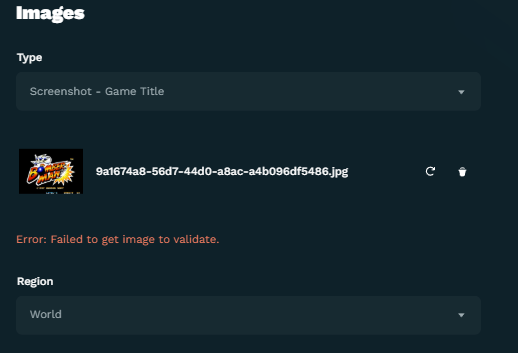 viritys Posted 10 hours ago Posted 10 hours ago Someone had uploaded a titleshot as gameplay for https://gamesdb.launchbox-app.com/games/details/21980. When trying to change the image type, I got "Error: Failed to get image to validate" and it didn't let me click "Done". Fixed it by saving that very same image to myself and uploading it as a replacement for itself, after which it did let me change the type just fine. Just wanted to record this bug here in case it's a symptom for something bigger. Quote