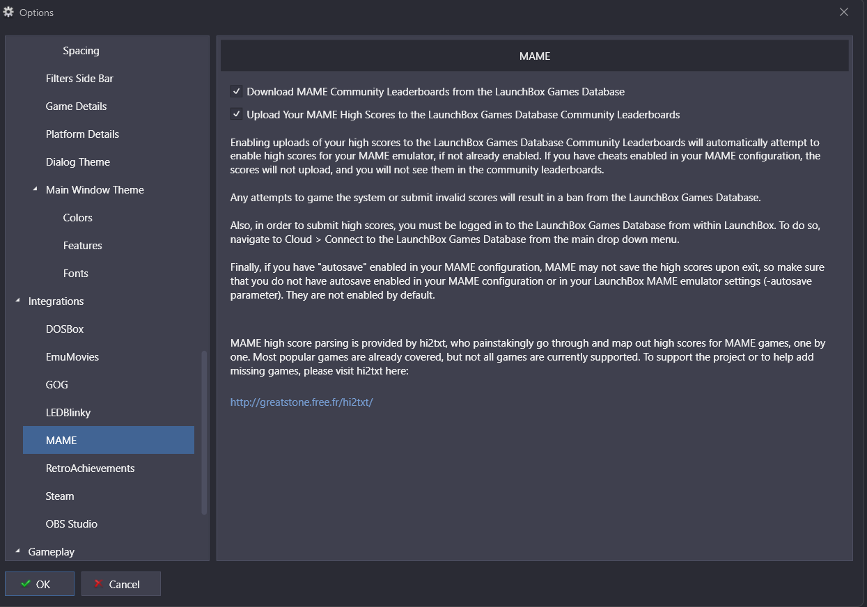 Pixelfetish Posted Friday at 03:05 PM Posted Friday at 03:05 PM (edited) Hello, today I want to solve the problem, why my high scores are not being uploaded. I think all settings are correct, also logged in to Launchbox database and RetroAchievements with valid logins as registered user. But my root MAME directory is set to another drive, just because I do not want any updates to cause additional work for me than just to hit the "Import Mame full set button". I have attached my debug log and as expected hi2txt still searches in the Launchbox-based root MAME-folder. Well, it is still the root folder, but I redirected possibly all folders like hiscore, nvram through mame.ini, as you can see here: Is there any way to give hi2txt the proper root-folder for MAME? It does not seem to take it from the mame.ini. Or is this part of the "anti-cheat" rules and it has to access exactly the Launchbox-based root MAME-folder? btw, I am using the Unofficial Mame highscore.dat from here: https://highscore.mameworld.info/ I do not know if this is still necessary, as MAME seems to have its own highscore.dat file at the right spot in <MAME-root>\plugins\hiscore Debug 2025-12-12 03-32-34 PM.log Edited Friday at 10:11 PM by Pixelfetish Quote