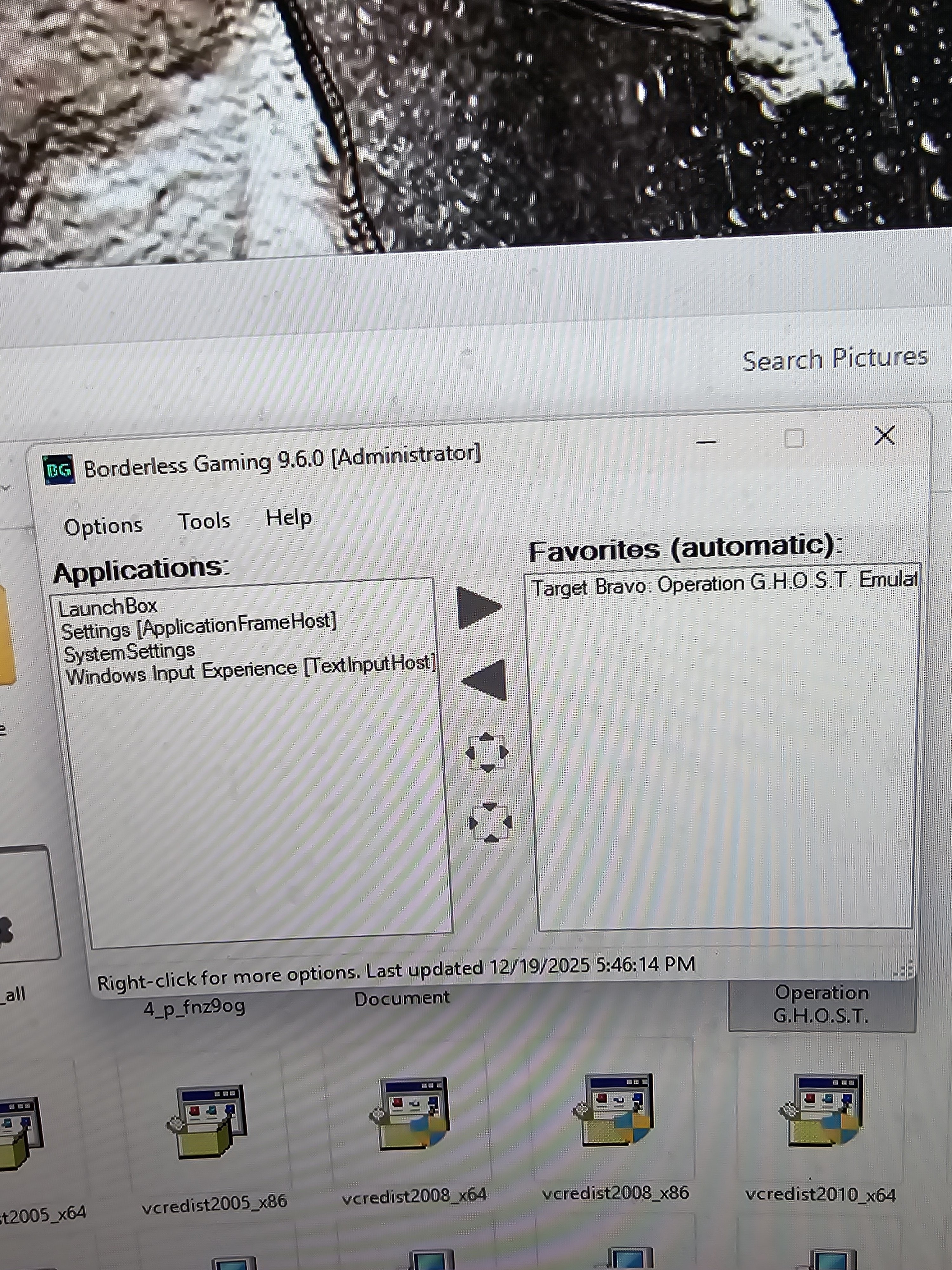wolfenstein0099 Posted 8 hours ago Posted 8 hours ago Im using an AHK script to run Target Bravo on Teknoparriot in full screen with boaderless gaming. There is a patch but cant use it because my monitor is ultra wide 3440 x 1440. This is the script im using... #SingleInstance Force Run, "C:\Program Files (x86)\Borderless Gaming\BorderlessGaming.exe"" Sleep, 1000 Run, C:\Users\Wolfe\Documents\TeknoParrotUi.exe --profile=TargetBravo.xml ~Esc:: Process,Close,TeknoParrotUi.exe Run,taskkill /im "TeknoParrotUi.exe" /F Process,Close,BorderlessGaming.exe Run,taskkill /im "BorderlessGaming.exe" /F return I even tried to add... $Esc:: { Process, Close, {{{StartupEXE}}} } Didn't work either. So im loading off the AHK everything boots like it should but when I exit the game even In bigbox mode with close active window. The window of boaderless gaming is still open. Not sure how ro close it when the game exits. Ill post a Pic of my window. Thank you Quote