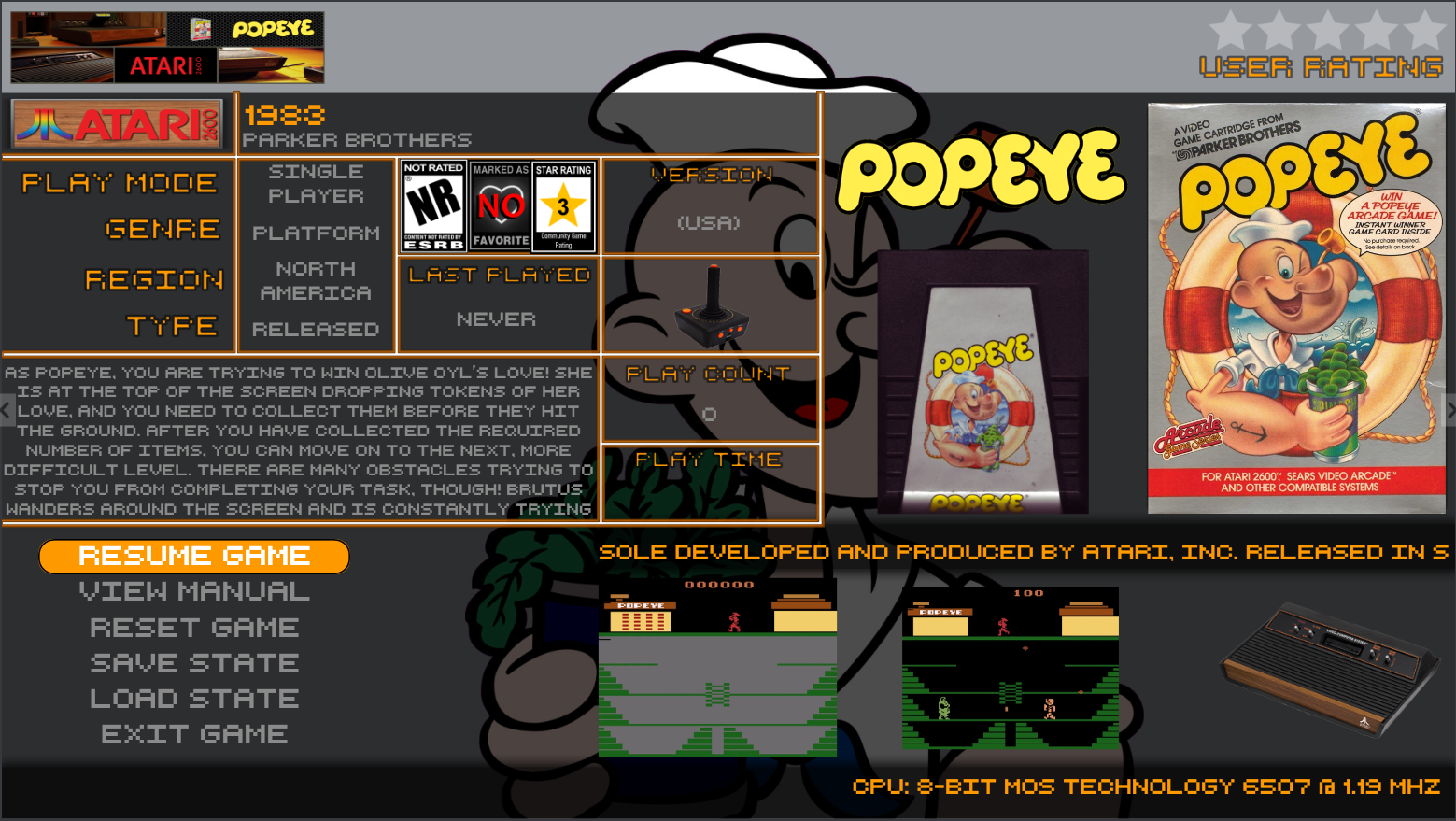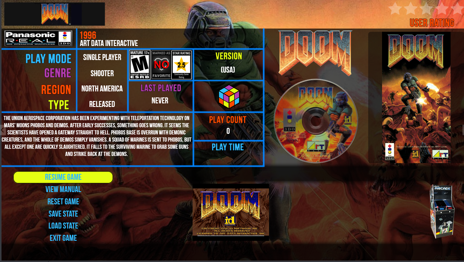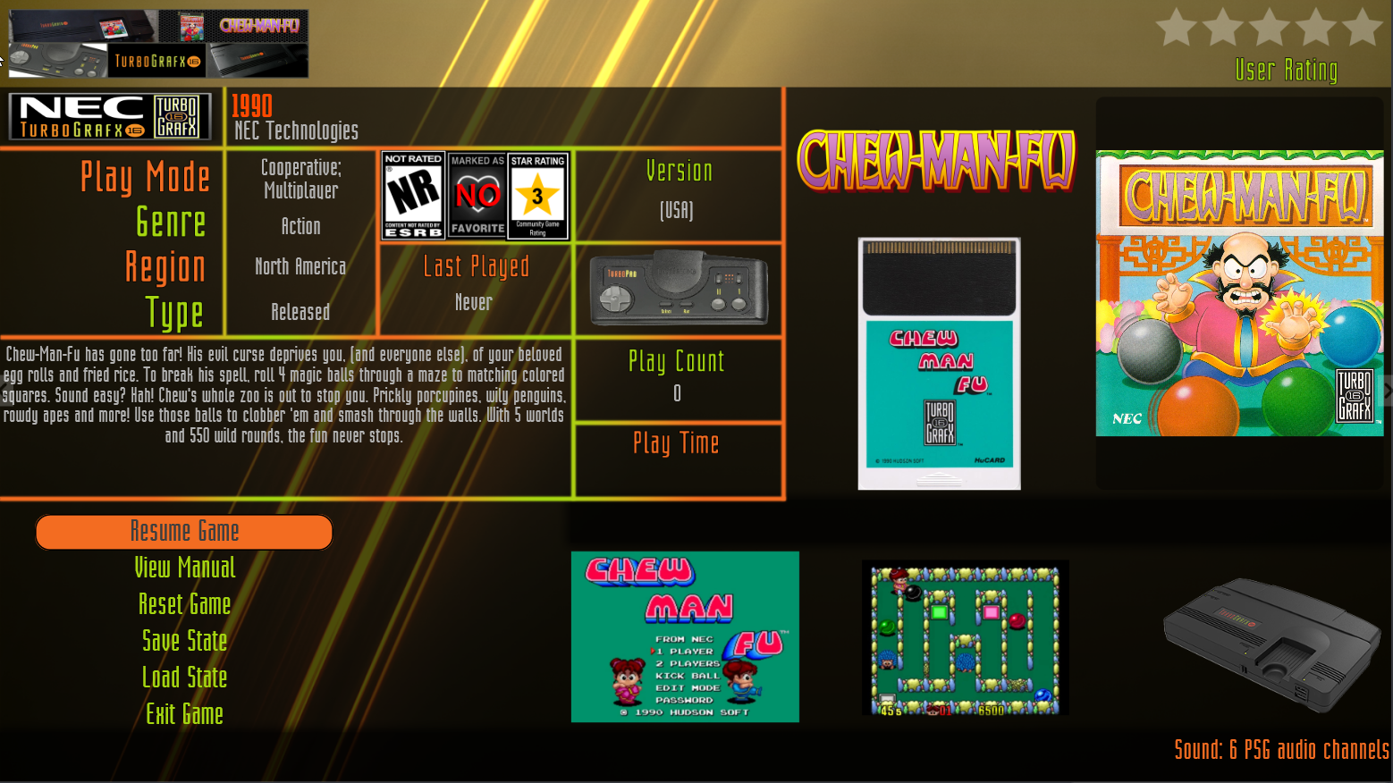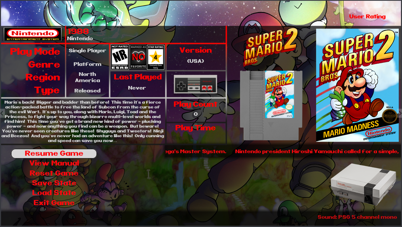 Shredder_guitar Posted January 1 Posted January 1 (edited) A few theme specific and then a generic launch box pause menu. Still testing... may add more, but I don't think i want to cover every console...undecided at this time. Inspired by Kodi Aeon MQ Info theme. Displays Metadata Playmode Genre Region last played Game version or disc number play count game time played game notes publisher release year ESRB rating Favorite - yes/no community overall rating user rating Game Notes Scrolling metadata Intro wiki Data for current console system specs for current console Artwork Wheel logo Banner Game Clear Logo (top slide down animation) Cart Front (Side slide animation) Box front (Cycles between front and back box art) Game Title Screenshot Gameplay screenshot Console image Badges Game completion Edited January 2 by Shredder_guitar 1 Quote