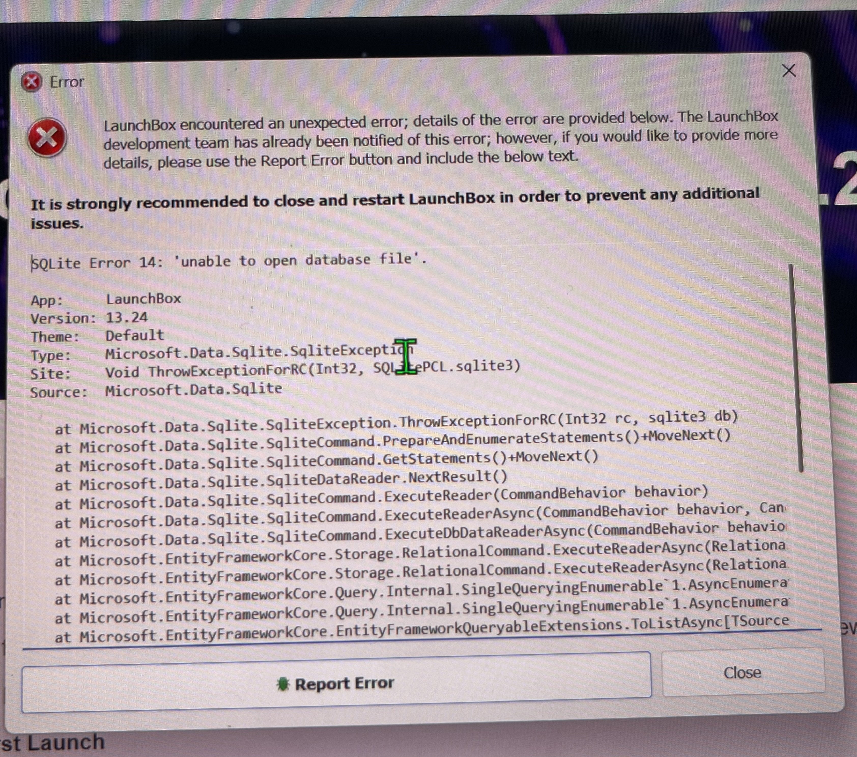 Hi I am getting an error since updating from Launchbox (rev 11.4 - whatever one comes with eXoWin3x) to 13.24. Launch box won’t load and throws error. Was working before update.