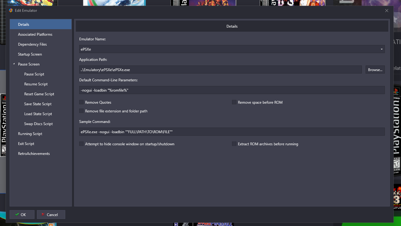 Mandarynek Posted yesterday at 09:42 AM Posted yesterday at 09:42 AM I would like to configure LaunchBox so that PSX games are opened using ePSXe. The latest version supports CHD files, and that’s the format my games are in. Unfortunately, LaunchBox skips ePSXe and uses a core instead. I don’t want to use a core because I get audio crackling and can’t fix it, while everything works perfectly in ePSXe. My settings are shown in the screenshot. What should I change? Quote