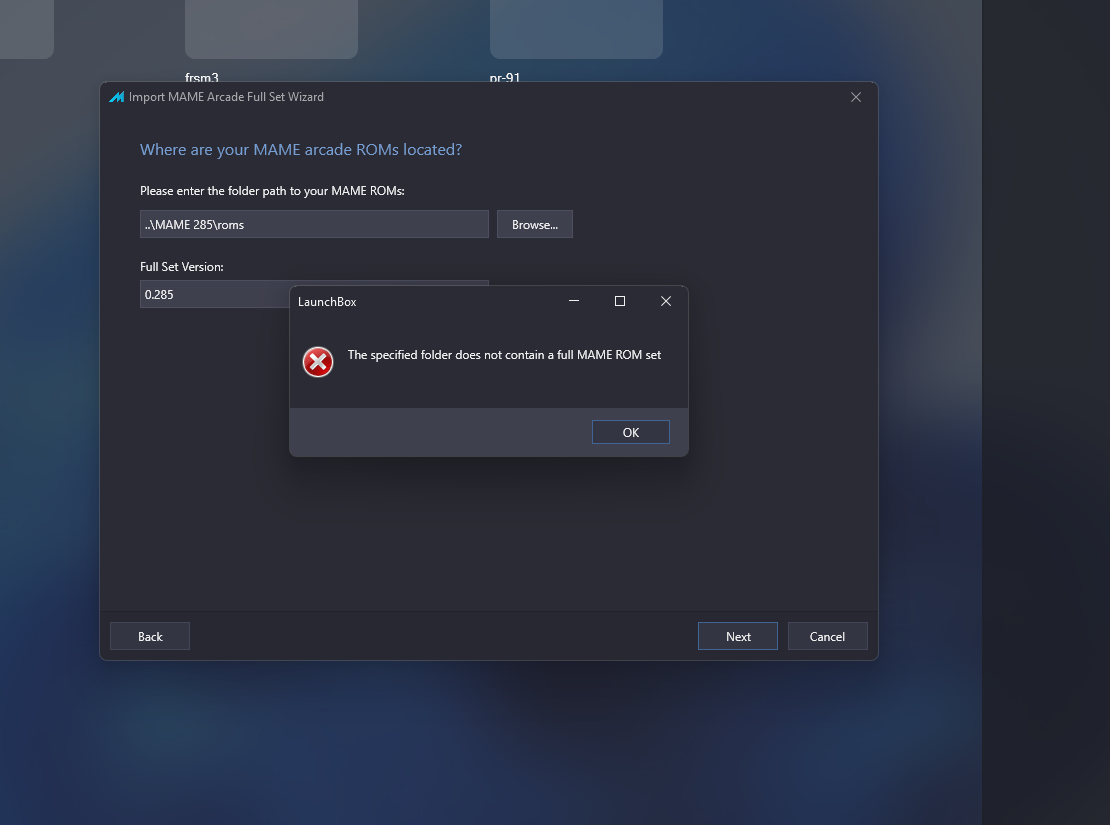 DJ DUDE Posted 16 hours ago Posted 16 hours ago So confused! Thanks in advance everyone! Brand new and I'm trying to set up a mame fullset 0.285 in launch box. I have downloaded the non merged zip from github mirror site for pleasuredome. I realzie these are rorrent files so I used trrntzipUI.net to get them back to regular zip file (I think, first time using that utility.) I have put that file and copies into various directories: in my mame rom, in launchbox , etc. When I select arcade and browse for the roms, I have tried 3-4 different locations and I still get this screen as attached. Not sure what exactly I'm doing wrong. Been at this for more than 10 hours total over 4 days. I did manage to upload a frogger rom set via the IMPORT ROM files dialogue. It shows up in BIGBOx and attempts to load. Also tried using mame by itself command line, I point towards the zipped frogger rom...it gives me a bab boy dialogue about not finding directx 9 3d. I tried to rectify that, but stil doesnt run from the command line. I'm trying to follow the pinned instructions on launch box to a tee... but it says to put your non merged roms into where ever (I forget now....so tired!) and it still gives me the attached image result. I'm not sure if I'm putting the correct regular zip rom set into the correct directory...or if its actually still tz zipped? (Properties just says zip file.) I've got a tankstick vr setup I haven't even used once in a month! Any help or a link to a very exacting file would be greatly appreciated. I'm sure its something simple...its gotta be! Quote