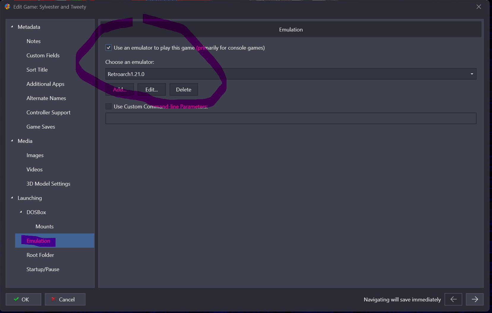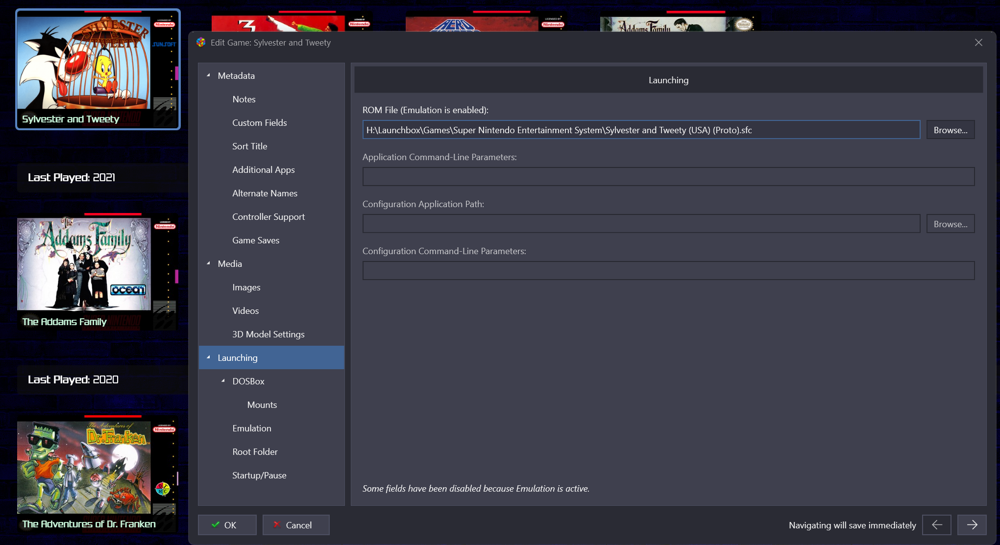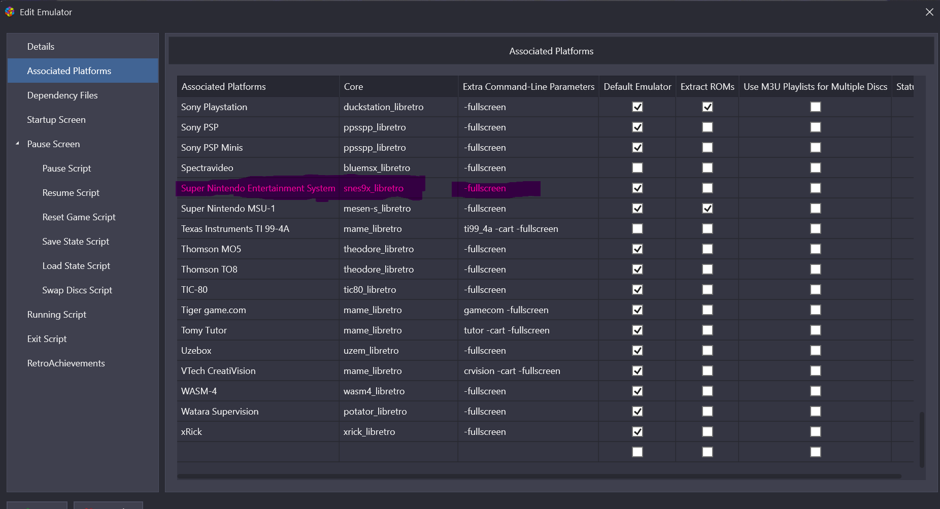 launchretrogirl2562 Posted 4 hours ago Posted 4 hours ago (edited) This is what should work Emulator Settings Only thing u need to pay attention to is pointing it to your retroarch exe Associated platform settings For u...associated platform should have the value 'Super Nintendo'...the rest u can use the same as mine And when u EDIT one of your games...u should see this: Launching has a link to the .sfc game...in my case Sylvester And in emulation tab u should see that it has an emulator...in this case RETROARCH attached Can u check if at least these things do match with your setup? Cause I also have my SNES games in .sfc format...and use Retroarch...and use the snes9x_libretro core. So if mine works...then yours should too and just means either u messed up the emulator config, or u messed up with linking the Retroarch setting to your platform To be on the SAFE side...just create a NEW EMULATOR...call it RETROARCHTEST or something...and apply my above settings. When u get to associated platform...and u choose your 'Super Nintendo' and the core, and set the fullscreen setting...if u then CHECK the checkmark to make this your default emulator for SNES...then Retroarch will tell u or ask u if u want to apply it for all games in your Super Nintendo platform. Click YES...and then u start from fresh and it should be properly attached. Edited 4 hours ago by launchretrogirl2562 Quote