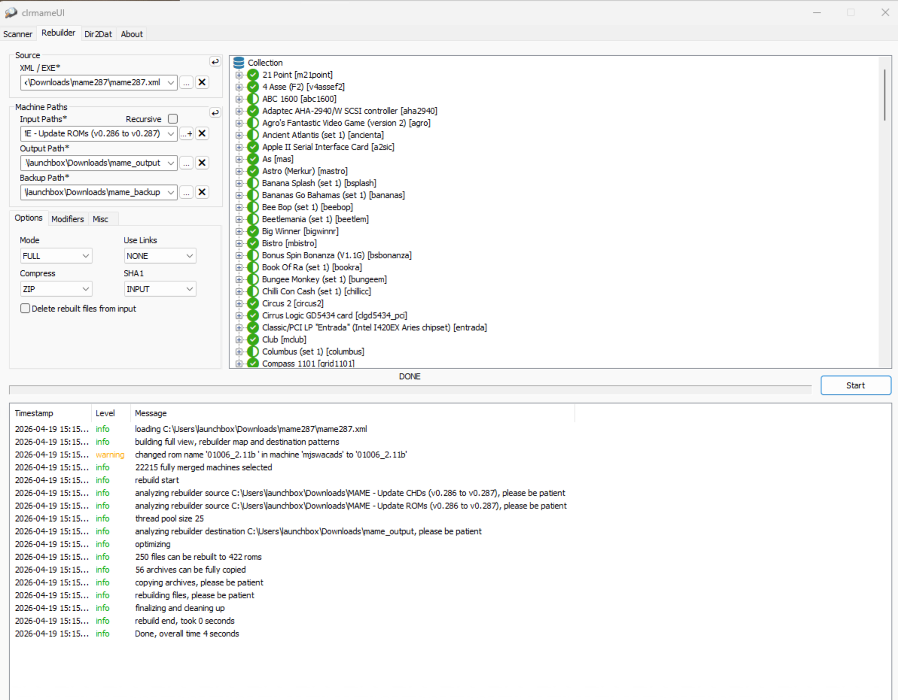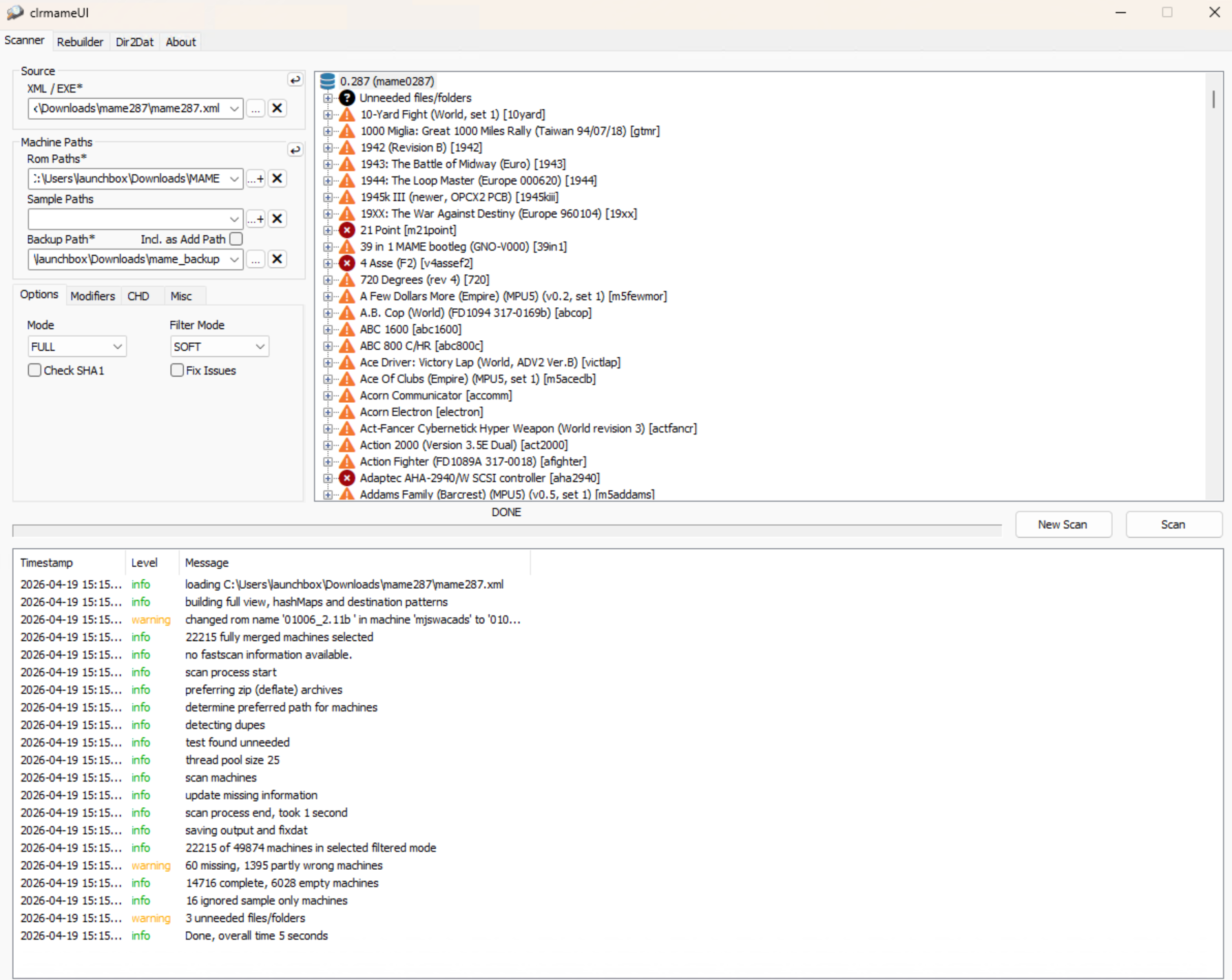 xokia Posted 1 hour ago Posted 1 hour ago (edited) I have a full merged set of 0.286 I'd like to update it to 0.287. I downloaded the updated 0.287 CHD and Roms. I am trying to use clrmame 0.6.3 to update 0.286 to 0.287 First thing I did was download mame 0.287 and then creates a mame287.xml file Then in the clrmame GUI for the source I use the mame287.xml file Input paths: Point to the 0287 CHD and Roms output path: I just create a directory called output_paths same with backup I am thinking I should be pointing to the MAME 0.286 directory? (didnt want to screw up my directory if it failed) I assume I take the output_path files and just copy them into MAME 0.286 directory? Now for the scanner side for the source XML I choose the same 0.287.xml Rom Paths: I point the the MAME 0.286 ROM/CHD files Backup_path same backup path that was used in rebuilder. However rebuilder seems to run fine but when I run the scanner I get a bunch of issues. Anyone know how to do this successfully? You would think with as long as MAME has been around it would be more user friendly or at least provide more meaningful prompts. Edited 1 hour ago by xokia Quote